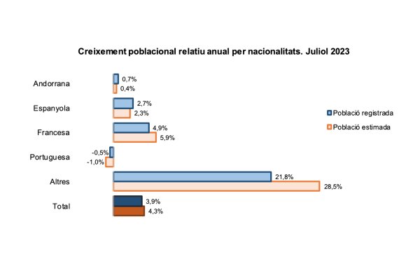 Per nacionalitats, l'increment anual mesurat el mes de setembre es concentra en el col·lectiu d'altres nacionalitats amb un total de 2.675 persones (27,7%), seguit de les persones de nacionalitat espanyola (1,8%), francesa (4,6%) i andorrana (0,4%). Les persones amb nacionalitat portuguesa, però, registren un decrement de l'1% respecte del mateix mes de l'any anterior.