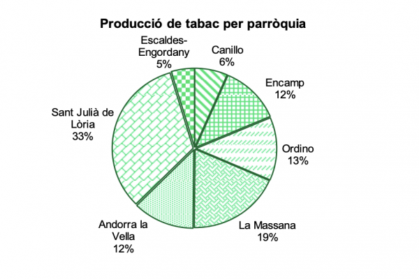 Pel que fa a la distribució territorial de la producció, Sant Julià de Lòria continua essent la parròquia amb major pes en el conjunt del sector tabaquer, amb una aportació del 36,3% del total recollit l’any 2024. A certa distància se situa la Massana, amb un 19,6% del volum global. Les altres parròquies registren nivells inferiors i complementen la producció total amb quotes menys significatives, mantenint-se la concentració territorial com una característica estructural del sector.