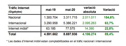 El tràfic per Internet en GB durant el mes d'agost se situa en 7,29 milions de GB, fet que representa una variació percentual positiva del +41,6% respecte al mes d'agost de l’any anterior.